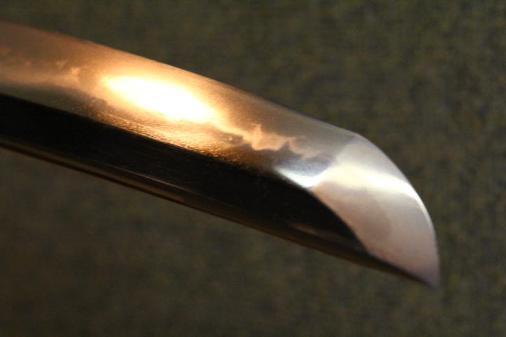 切先は直ぐに小丸に返り匂口の絞まったハッキリした鋩子。地鉄はやや明るく板目肌に杢目まじり、部分的に肌立ち心、鎬地柾がかる鍛肌で、刃中に処々小足入り棒映りうっすらと立つ。飽きの来ない出来栄えである。