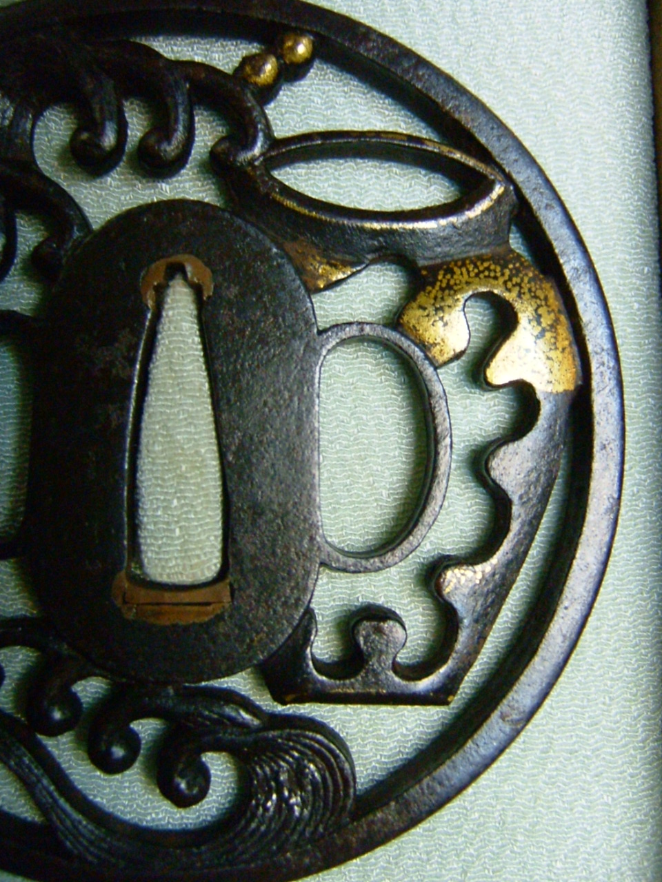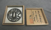 佐藤寒山箱書き有り 昭和三十六年八月十五日日本刀大鑑-鍔・小道具篇 145頁所載刀剣趣味-第49号昭和37年7月号表紙掲載特別貴重小道具認定書紛失丸形 鉄地 両櫃孔 波に臺図透 金象嵌銀象嵌径81mm 厚5mm
