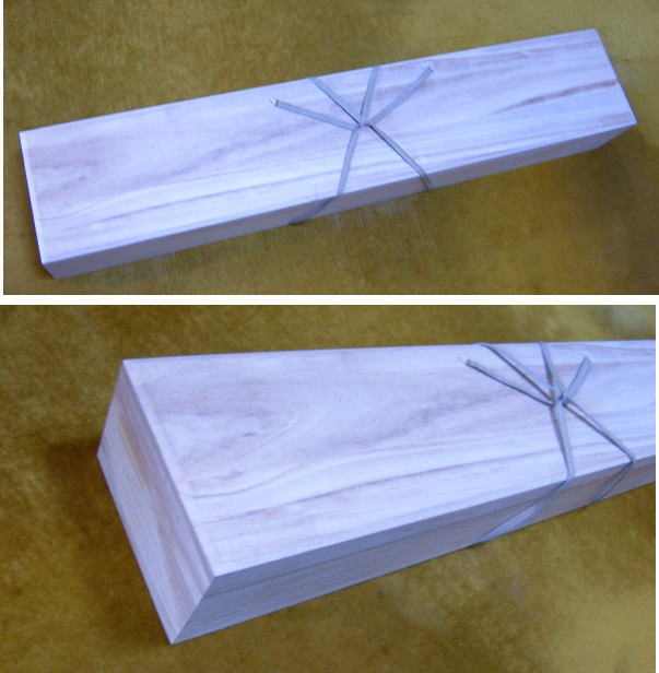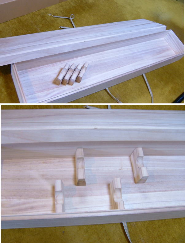 大桐箱コンパクト版 収納美術刀剣保存用新品 刀剣収納用の桐箱コンパクト版です。新品未使用 枕木は木工ボンドなどで接着すれば自在に配置できる仕組みです。 枕木は平行に並べるとピッタリ箱内径にフィットします。 内容量もたっぷり、枕木を外せば大刀で6振程度は収まります。 手入用具なども一緒に入れられる余裕があるので便利だと思います。 注意:写真にある箱の中身の刀剣や道具は付随しません。